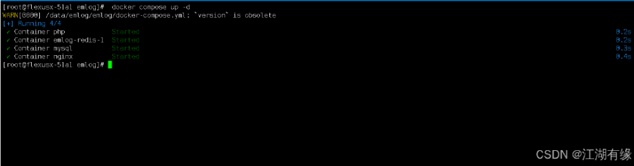 [root@flexusx-51a1 emlog]# docker compose up -dWARN[0000] /data/emlog/emlog/docker-compose.yml: `version` is obsolete[+] Running 4/4 ✔Container php Started 0.2s ✔Container emlog-redis-1 Started 0.2s ✔Container mysql Started 0.3s ✔Container nginx Started 0.4s