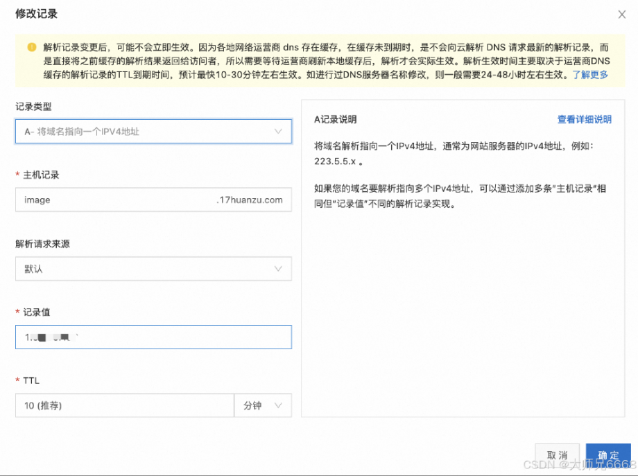 在域名解析中,添加一个 A 类型的解析,然后主机记录填写刚刚定义的 image,记录值填写自己的服务器的外网 IP 地址,然后点击确认即可添加。