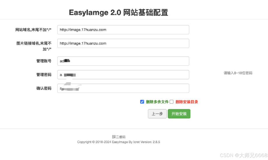 这里的基础配置,如果没有特殊要求,可以直接就用默认即可,注意记住这里的管理账号和密码,等下登录系统要用到。点击开始安装之后,稍等一下下就完成了,然后就跳转到登录页了。