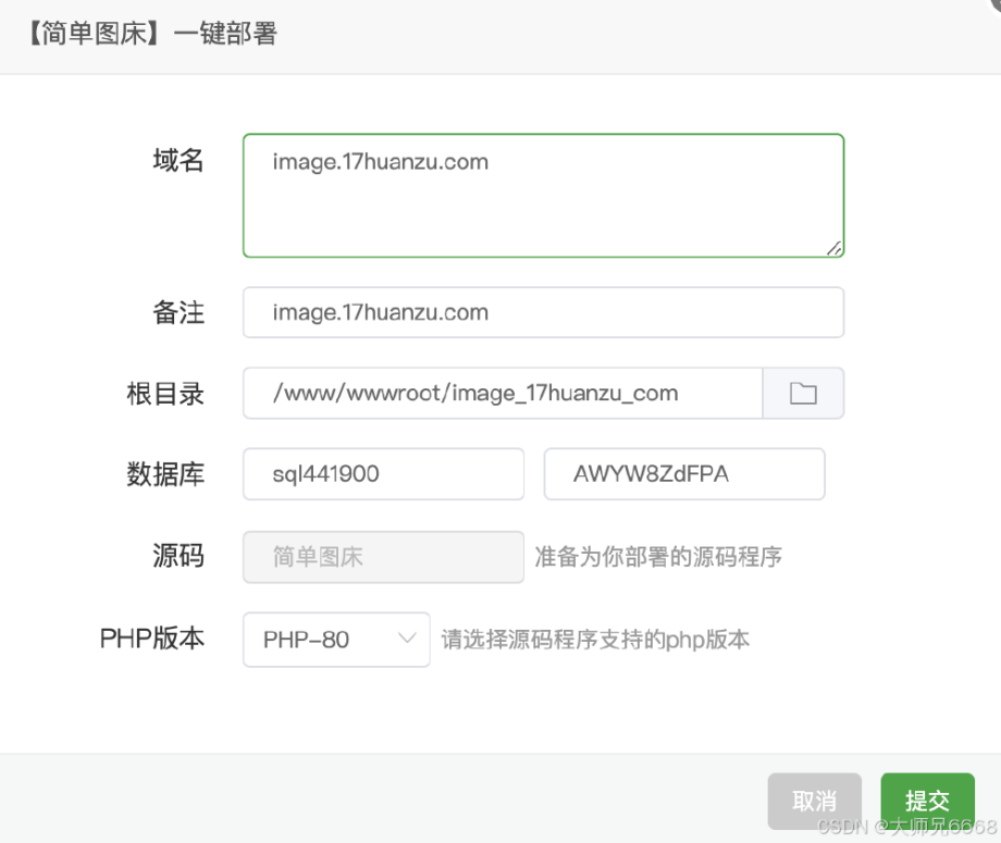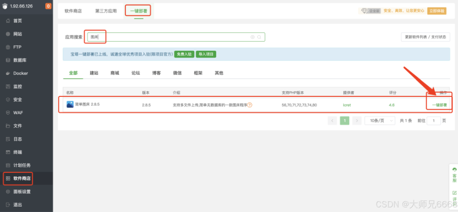在宝塔软件商店,选择一键部署,然后搜索图床,就可以看到今天介绍的主角“简单图床”了,这里我们点击它后面的“一键部署”即可进入部署。