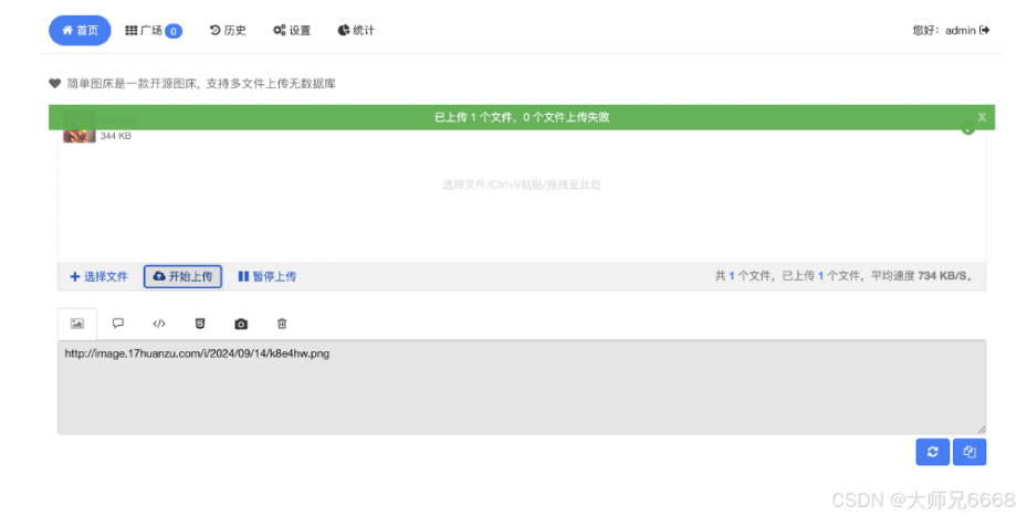 这里我们上传本地一张图来验证一下效果,可以看到,在图片上传完毕之后,会有相应的提示,并且会生成相应的链接地址。