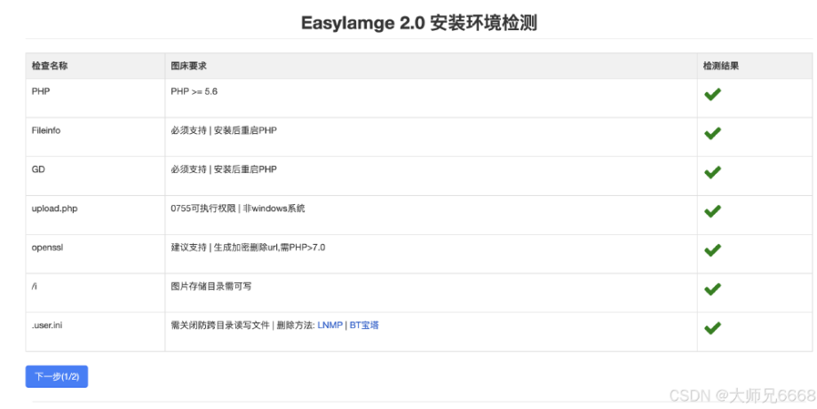这里大家根据指引去操作,确保每个检测项后面的检测结果都是对勾,就可以点击下一步了。这里需要提一下的是,如果最后一项.user.ini 这里如果一直检测不通过,直接这个网站的文件目录中,找到这个文件,并且删除就可以了。
