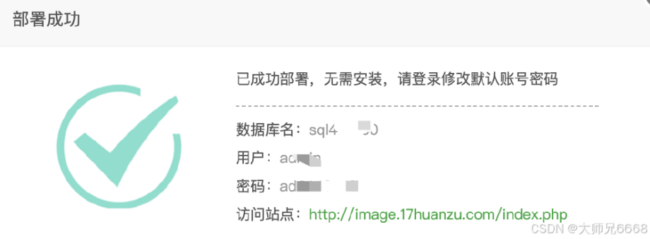 稍等一下,几秒钟,就提示建站成功了!然后就可以根据提示访问这个站点,注意记住这里的用户名和密码,一会儿登录图床系统的时候需要用到。