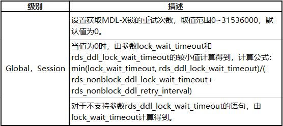 获取MDL-X锁的最大重试次数。当到达最大重试次数仍未获取到X锁,DDL会失败报错。