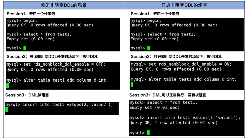 rds_nonblock_ddl_enable = ON,来打开session级别的开关。