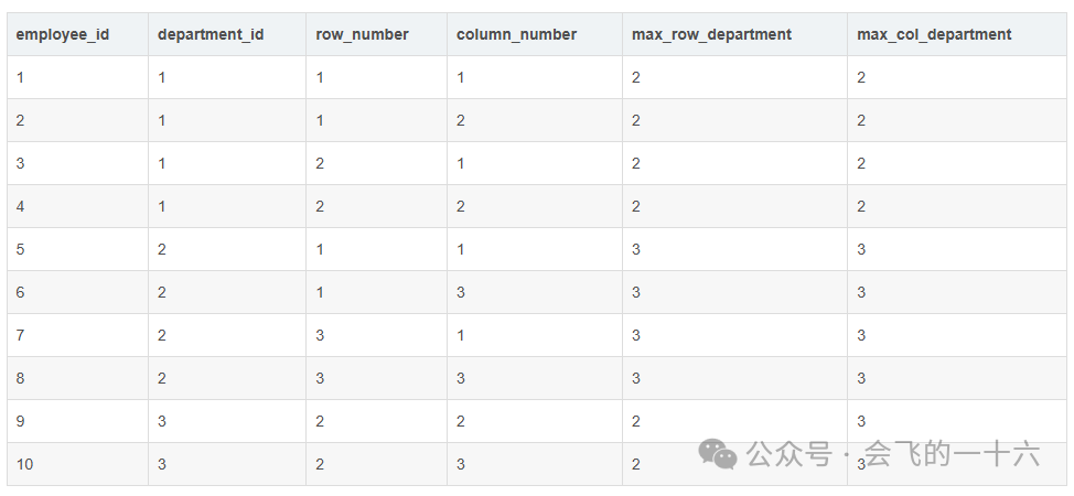 -- 使用分析函数计算每个部门内每行对应的最大行号和最大列号SELECTemployee_id,department_id,row_number,column_number,MAX(row_number) OVER (PARTITION BY department_id) AS max_row_department,MAX(column_number) OVER (PARTITION BY department_id) AS max_col_departmentFROM employees;
