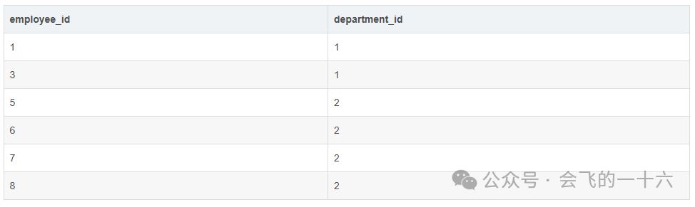 -- 子查询按部门找出最大行号和最大列号SELECT department_id, MAX(row_number) AS max_row, MAX(column_number) AS max_colFROM employeesGROUP BY department_id;-- 主查询筛选出各部门角落座位的员工SELECT e.employee_id, e.department_idFROM employees eJOIN (SELECT department_id, MAX(row_number) AS max_row, MAX(column_number) AS max_colFROM employeesGROUP BY department_id) m ON e.department_id = m.department_idWHERE (e.row_number = 1 OR e.row_number = m.max_row)AND (e.column_number = 1 OR e.column_number = m.max_col);