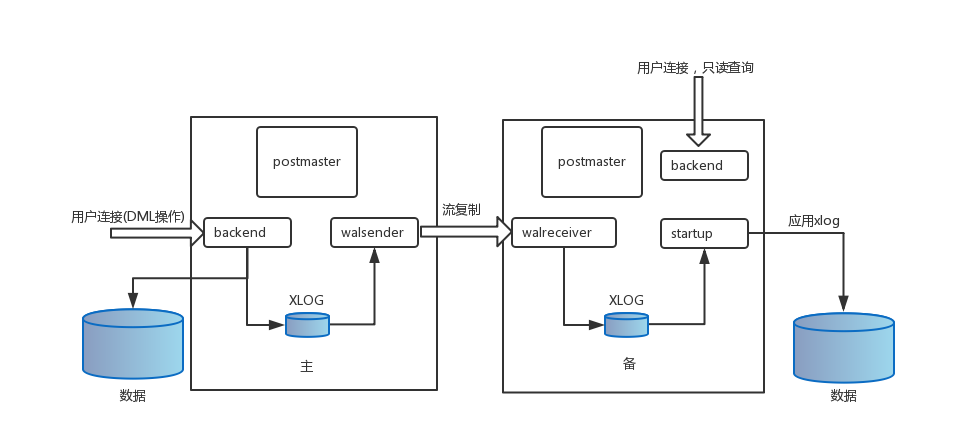 PG主备流复制的核心部分由walsender,walreceiver和startup三个进程组成。