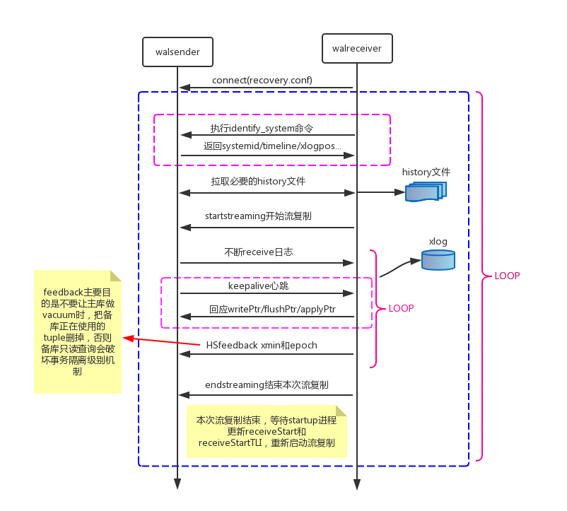 执行wal_startstreaming开始启动流复制,通过walrcv_receive获取WAL日志,期间也会回应主库发过来的心跳信息(接收位点、flush位点、apply位点),向主库发送feedback信息(最老的事务id),避免vacuum删掉备库正在使用的记录;