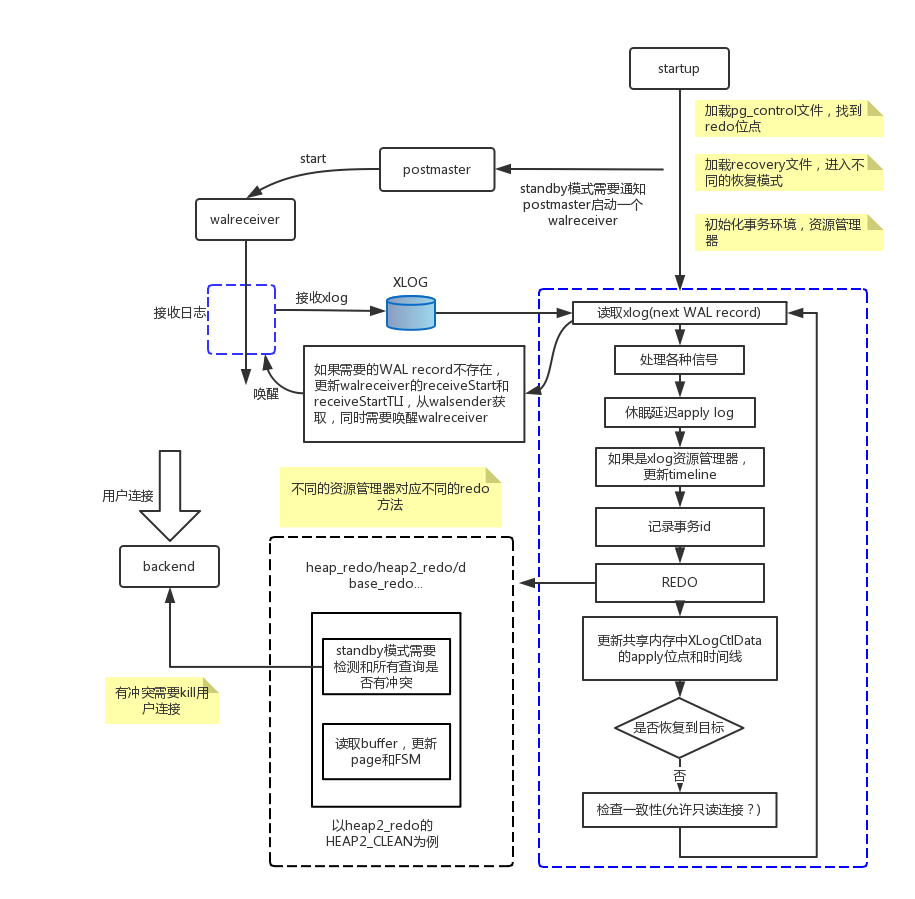 还有部分redo操作(vacuum产生的record)需要检查在Hot Standby模式下的查询冲突,比如某些tuples需要remove,而存在正在执行的query可能读到这些tuples,这样就会破坏事务隔离级别。通过函数ResolveRecoveryConflictWithSnapshot检测冲突,如果发生冲突,那么就把这个query所在的进程kill掉。