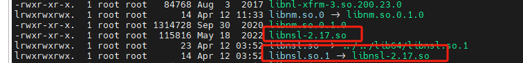 该文件位于/usr/lib64中缺失,从红帽或CENTOS下的/usr/lib64下找到同名文件,发现其实则为libnsl-2.17.so这个文件做的软连接,如下: