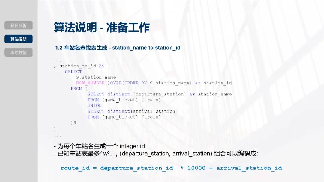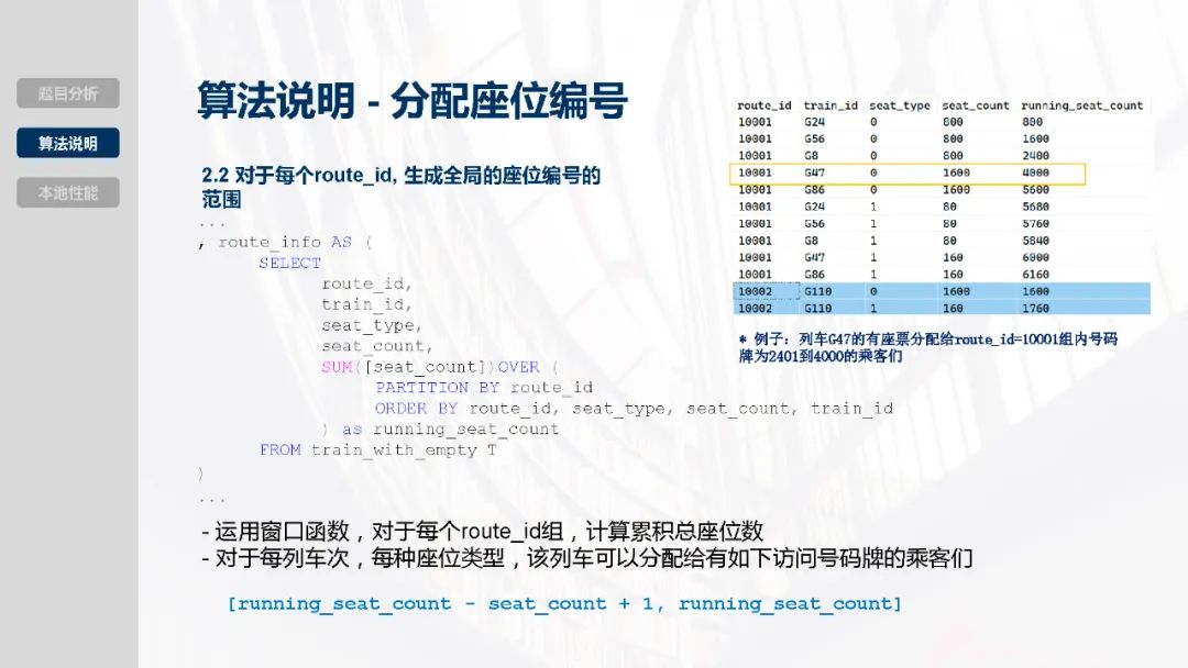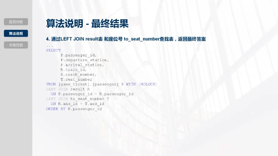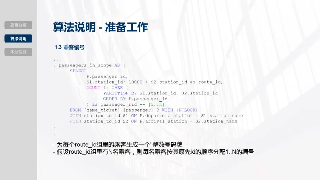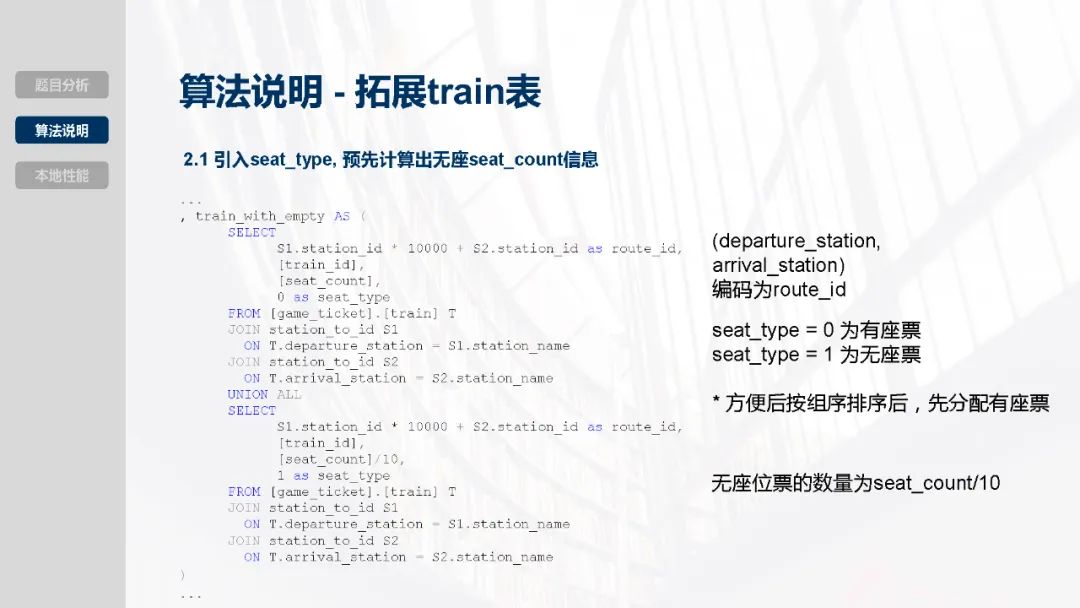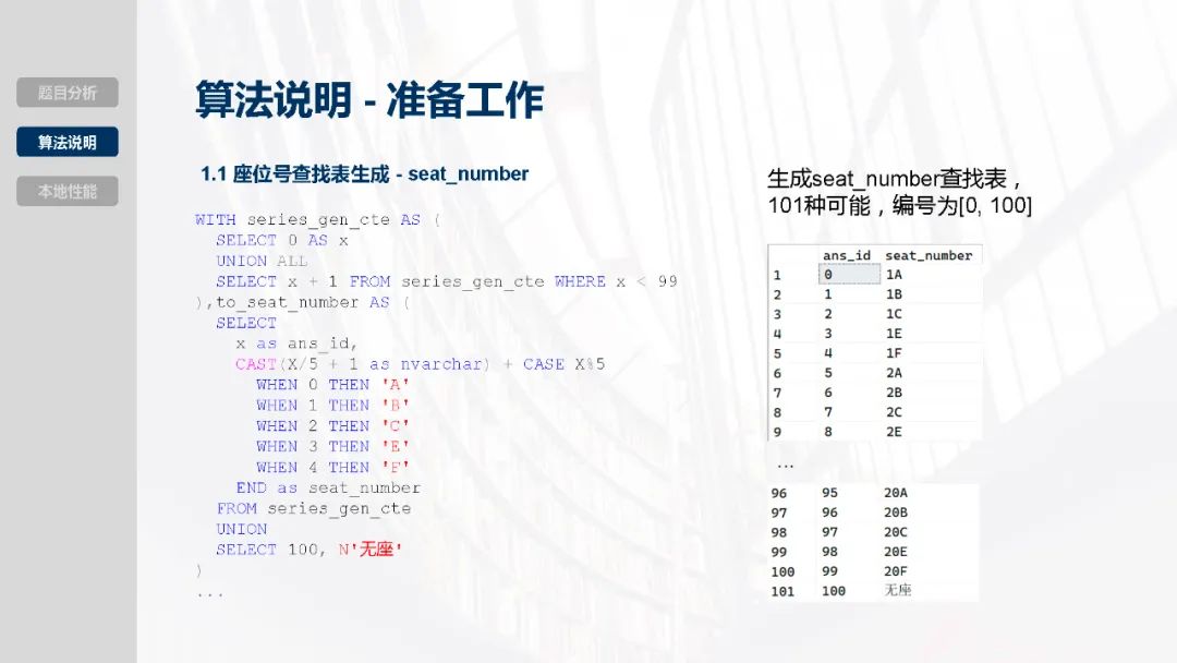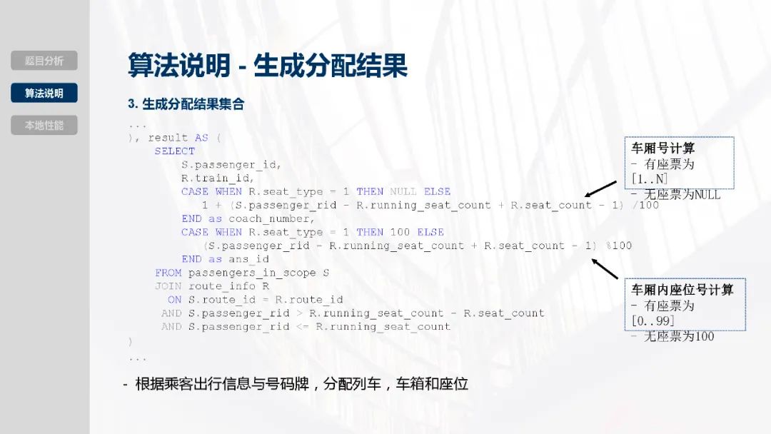 ;WITH series_gen_cte AS (SELECT 0 AS xUNION ALLSELECT x + 1 FROM series_gen_cte WHERE x < 99), to_seat_number AS (SELECTx as ans_id,CAST(X/5 + 1 as nvarchar) +CASE X%5WHEN 0 THEN 'A'WHEN 1 THEN 'B'WHEN 2 THEN 'C'WHEN 3 THEN 'E'WHEN 4 THEN 'F'END as seat_numberFROM series_gen_cteUNIONSELECT 100, N'无座'), station_to_id AS (SELECT S.station_name, ROW_NUMBER() OVER(ORDER BY S.station_name) as station_idFROM (SELECT distinct [departure_station] as station_nameFROM [game_ticket].[train]UNIONSELECT distinct [arrival_station]FROM [game_ticket].[train]) S), train_with_empty AS (SELECTS1.station_id * 10000 + S2.station_id as route_id,[train_id],[seat_count],0 as seat_typeFROM [game_ticket].[train] TJOIN station_to_id S1 ON T.departure_station = S1.station_nameJOIN station_to_id S2 ON T.arrival_station = S2.station_nameUNION ALLSELECTS1.station_id * 10000 + S2.station_id as route_id,[train_id],[seat_count] / 10,1 as seat_typeFROM [game_ticket].[train] TJOIN station_to_id S1 ON T.departure_station = S1.station_nameJOIN station_to_id S2 ON T.arrival_station = S2.station_name), route_info AS (SELECTroute_id,train_id,seat_type,seat_count,SUM([seat_count]) OVER (PARTITION BY route_id ORDER BY route_id, seat_type, seat_count, train_id) as running_seat_countFROM train_with_empty T), passengers_in_scope AS (SELECTP.passenger_id,S1.station_id * 10000 + S2.station_id as route_id,COUNT(1) OVER (PARTITION BY S1.station_id, S2.station_id ORDER BY P.passenger_id) as passenger_ridFROM [game_ticket].[passenger] P WITH (NOLOCK)JOIN station_to_id S1 ON P.departure_station = S1.station_nameJOIN station_to_id S2 ON P.arrival_station = S2.station_name), result AS (SELECTS.passenger_id,R.train_id,CASEWHEN R.seat_type = 1 THEN NULLELSE 1 + (S.passenger_rid - R.running_seat_count + R.seat_count - 1) / 100END as coach_number,CASEWHEN R.seat_type = 1 THEN 100ELSE (S.passenger_rid - R.running_seat_count + R.seat_count - 1) % 100END as ans_idFROM passengers_in_scope SJOIN route_info RON S.route_id = R.route_idAND S.passenger_rid > R.running_seat_count - R.seat_countAND S.passenger_rid <= R.running_seat_count)SELECTP.passenger_id,P.departure_station,P.arrival_station,R.train_id,R.coach_number,T.seat_numberFROM [game_ticket].[passenger] P WITH (NOLOCK)LEFT JOIN result R ON P.passenger_id = R.passenger_idLEFT JOIN to_seat_number T ON R.ans_id = T.ans_idORDER BY P.passenger_id
