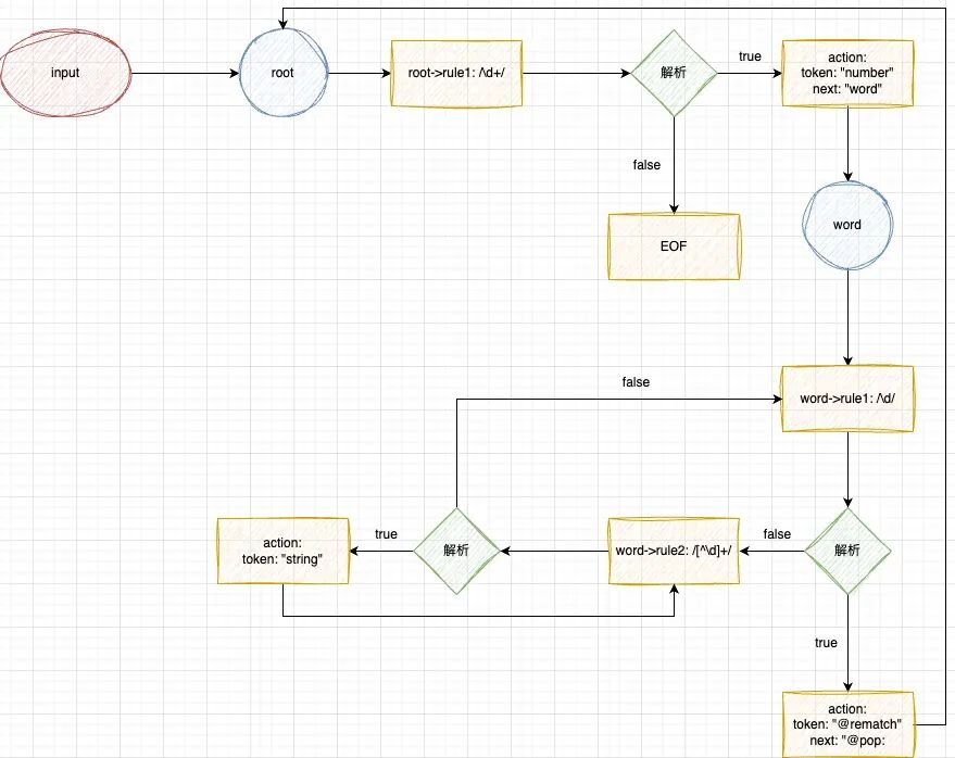 monaco.languages.setMonarchTokensProvider('myLanguage', {tokenizer: {root: [// [regex, action][/\d+/, 'number'],/*** [regex, action, next]* [/\w+/, { token: 'keyword', next: '@pop' }] 的简写*/[/\w+/, 'keyword', '@pop'],]}});