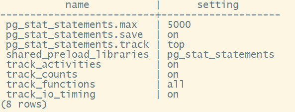 where name in('track_activities','track_counts','track_io_timing','track_wal_io_timing','track_functions','shared_preload_libraries','pg_stat_statements.max','pg_stat_statements.track','pg_stat_statements.save')