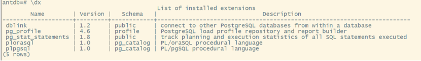 pg_profile扩展依赖于plpgsql和dblink扩展,也就是说要使用pg_profile扩展的话,则必须要同时安装plpgsql和dblink扩展。此外,如果要收集sql语句的统计信息,还需要额外安装pg_stat_statements扩展。这三个扩展插件antdb数据库中均自带,无需下载。
