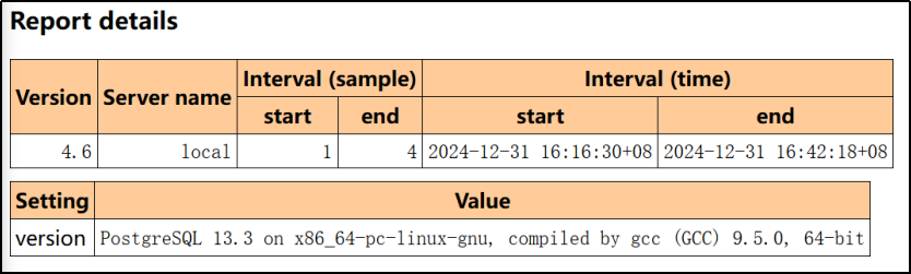 报告说明,此部分展示的内容有快照点、开始结束时间和数据库版本信息。