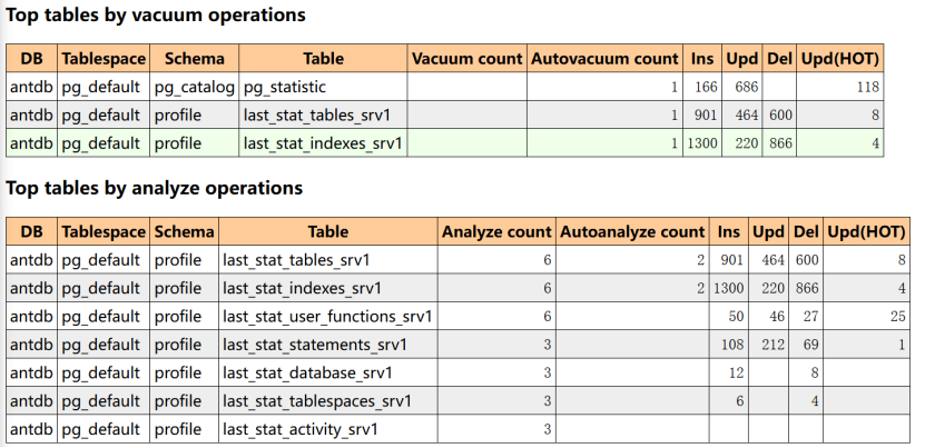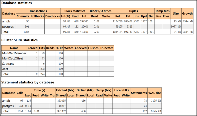 服务器统计,包含了数据库在此快照期间的统计信息,例如事务数、内存命中率、元组的操作统计等、数据库的调用次数等、数据库聚簇的统计信息,表空间的增长等等。