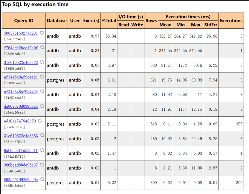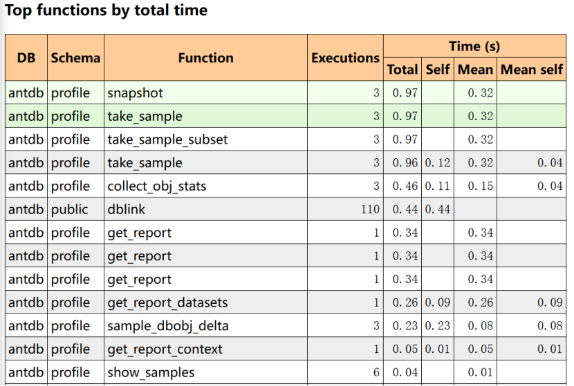adb -p 15432 -Aqtc "select profile.get_report(tstzrange(now() - interval '1 hour',now()))" -o awr_last1h_report.html