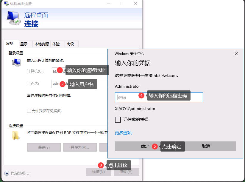 输入远程地址,点击连接后再把我们A电脑的用户名和密码输入后如下图就OK啦: