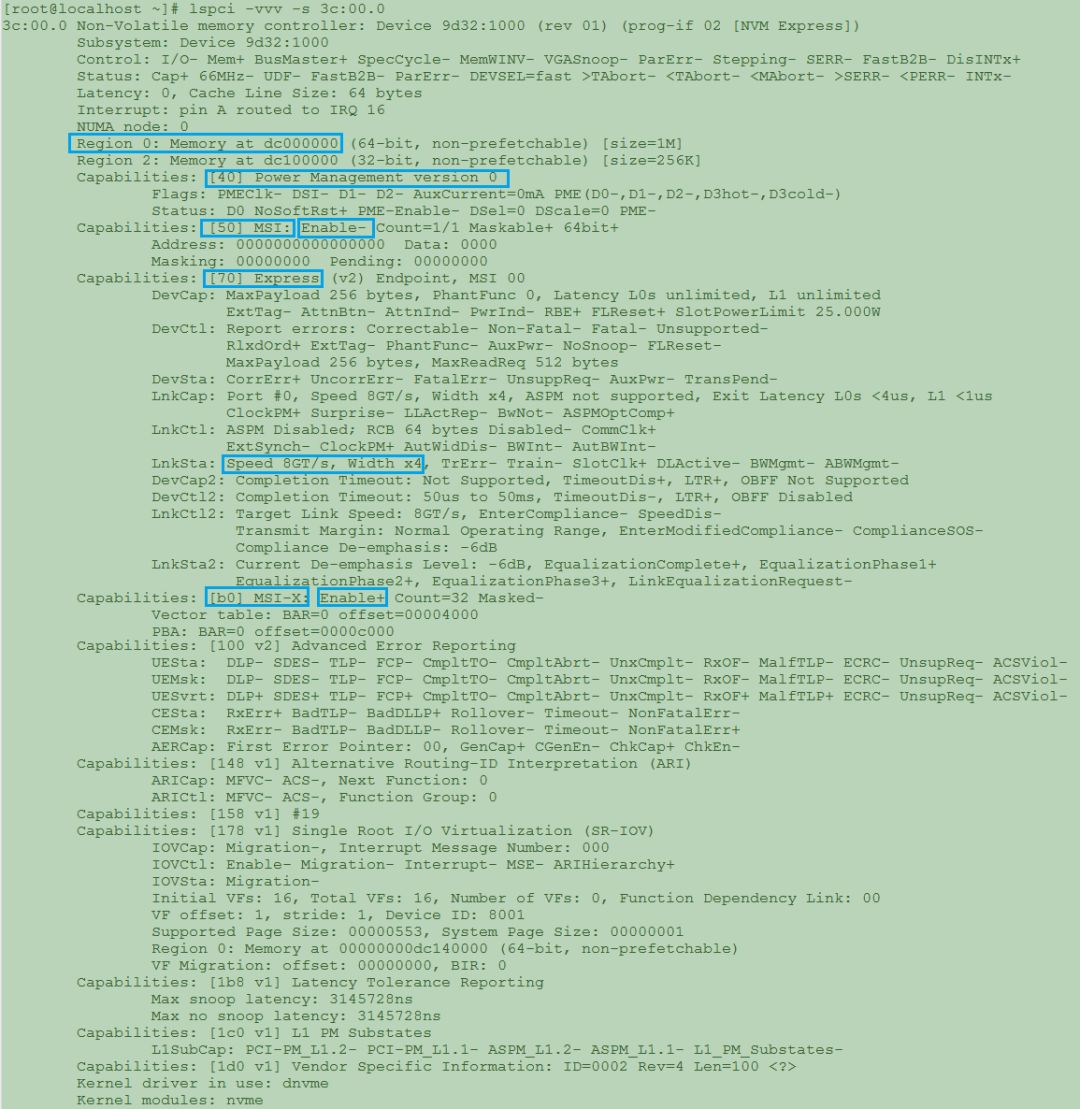 当然也可以使用lspci –vvv –s 3C:00.0命令来查看设备特性,初学者看到下面的列表也就一目了然了。