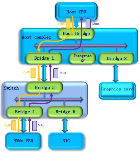 下面以NVMe命令下发为例简单描述PCIe设备的memory访问。NVMe命令下发的基本操作是1)Host写doorbell寄存器,此时使用PCIe memory写请求。如下图所示,host发出一个memory write(MWr)请求,该请求经过switch到达要访问的NVMe SSD设备。