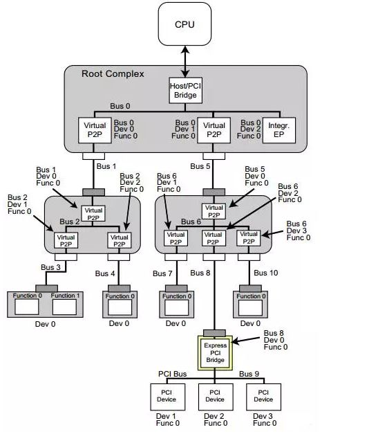 首先我们来看一下在x86系统中,PCIe是什么样的一个体系架构。下图是一个PCIe的拓扑结构示例,PCIe协议支持256个Bus, 每条Bus最多支持32个Device,每个Device最多支持8个Function,所以由BDF(Bus,device,function)构成了每个PCIe设备节点的身份证号。