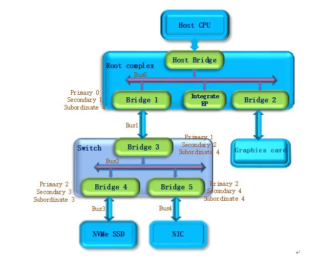 第三步,系统继续扫描Bus 2,将会发现Bridge 4。继续扫描,系统会发现Bridge下面挂载的NVMe SSD设备,系统将Bridge 4下面的PCI Bus定为Bus 3,并将该桥的Primary Bus Number 和 Secondary Bus Number寄存器分别设置成2和3,因为Bus3下面挂的是端点设备(叶子节点),下面不会再有下游总线了,因此Bridge 4的Subordinate Bus Number的值可以确定为3。