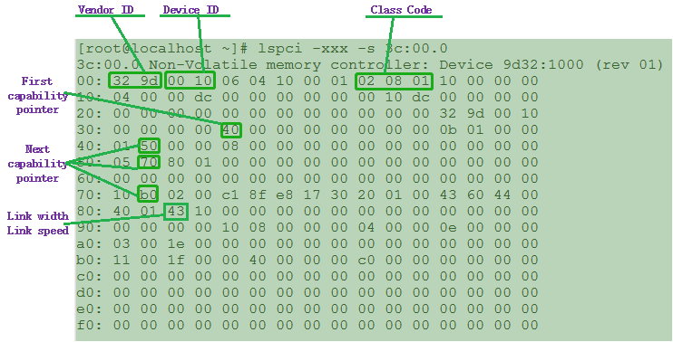 我们可以通过“lspci –xxx –s 3C:00.0”命令来列出该设备的PCIe详细信息(技术发烧友或数字控请关注该部分)。这些内容存储在PCIe配置空间,它们描述的是PCIe本身的特性。如下图所示(低位地址0x00在最左边),可以看到这是一个非易失性存储控制器,0x00起始地址是PCIe的Vendor ID和Device ID。Class code 0x010802表示这是一个NVMe存储设备。0x40是第一组capability的指针,如果你需要查看PCIe的特性,就需要从这个位置开始去查询,在每组特征的头字段都会给出下一组特性的起始地址。从0x40地址开始依次是power management,MSI中断,链路控制与状态,MSI-X中断等特性组。这儿特别列出了链路特征中的一个0x43字段,表示STAR1000设备是一个x4lane的链接,支持PCIe Gen3速率(8Gbps)。