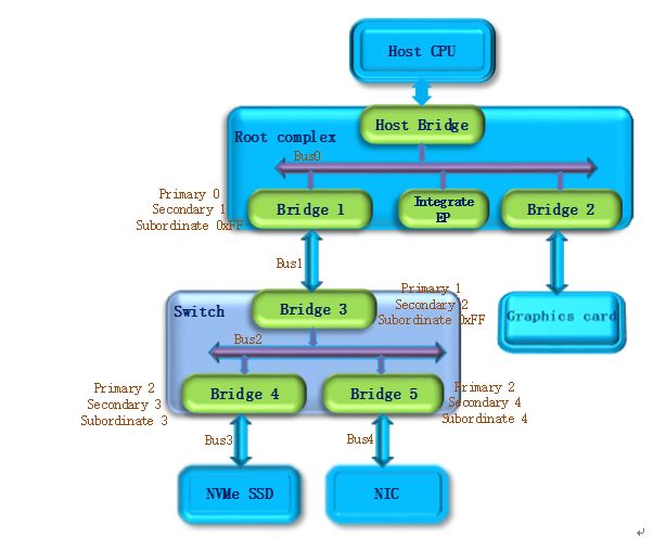 第二步,系统开始扫描Bus 1,将会发现Bridge 3,并发现这是一个switch设备。系统将Bridge 3下面的PCI Bus定为Bus 2,并将该桥的Primary Bus Number 和 Secondary Bus Number寄存器分别设置成1和2,和上一步一样暂时把Bridge 3 的Subordinate Bus Number设为0xFF。