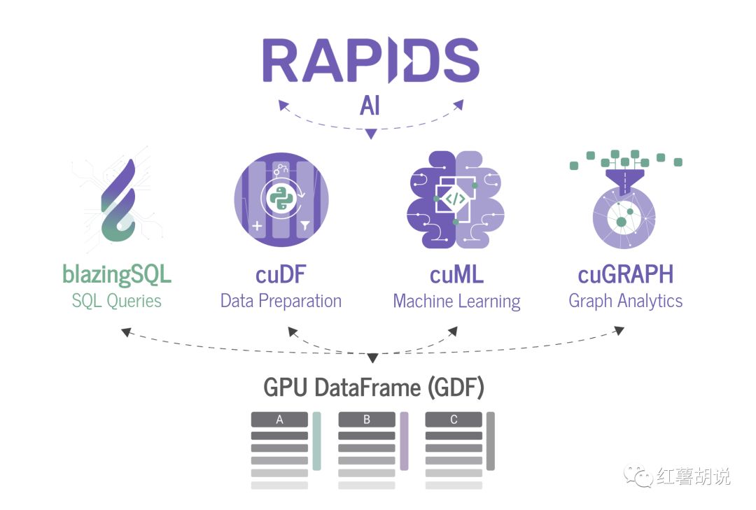 RAPIDS 包含一组软件库(BlazingSQL、cuDF、cuML、cuGraph),用来在 GPU 上执行端到端的数据科学计算和分析管道。