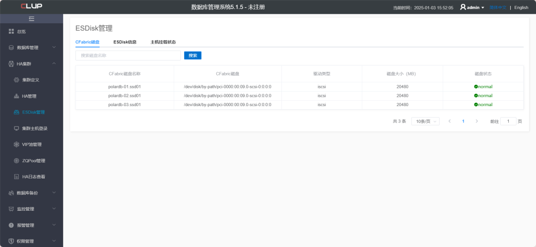 | polardb-03 | 10.197.165.52,172.16.1.52,172.16.2.52 | 8G/4C | 数据库存储节点 | CLup-agent |