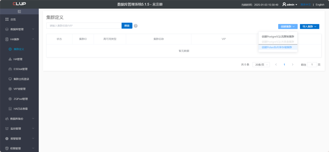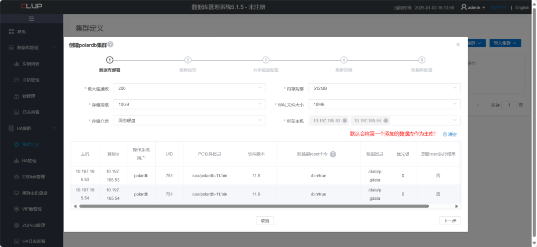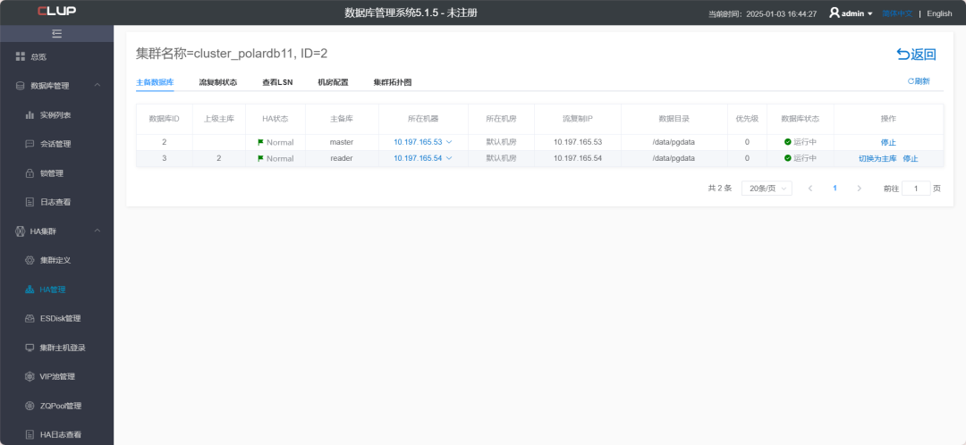 | polardb-01 | 10.197.165.50 | 4G/2C | CLup管理端兼数据库存储节点 | CLup |