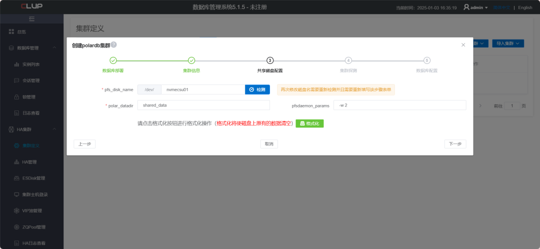 填写共享磁盘名称,检测后,进行磁盘格式化