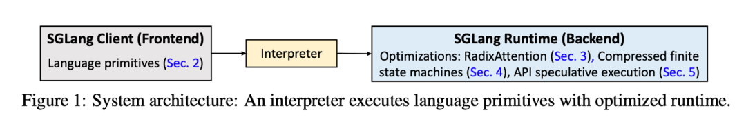 SGLang是一个对标vLLM的大语言模型推理框架, 系统的整体架构如下图,分为前端和后端。 前端是对调用大语言模型的一些常用操作的抽象,提供一系列原语。 后端是具体的对推理过程的优化。 SGLang的两点主要的优化是RadixAttention和Structured output。在此基础之上,作为大模型推理的基础框架, 后续也有很多其他的系统优化工作是在SGLang框架上的。