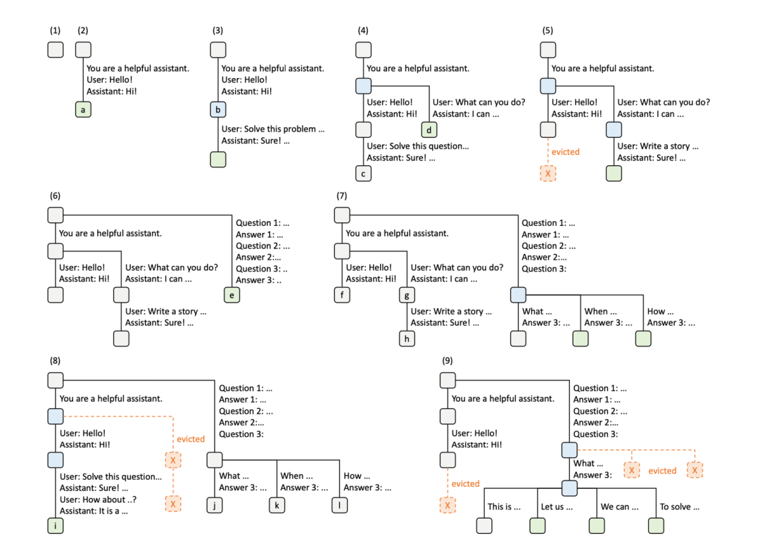 6-8是三个新请求,这三个请求之前共享一样的前缀Question1、Question2, question 3不一样。在处理6的请求的时候处理完了question1~question3, 后续的7、8中新增的两个请求只有qestion3不一样,因此前两个question的处理结果可以复用,只需要分别prefill一个question 3即可。然后因为空间的限制,需要逐出之前的kvcache。 9是四个在6中的请求的基础上扩写生成answer的请求,前三个question都是一样的,因此都可以复用,只需要生成四个answer即可。