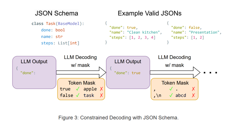 常见的实现结构化输出的方法,是用有限状态机表达给定的格式约束。 对于状态机中的每一个状态,对应一个合法的token集合。 我们只需要在模型decode的过程中,根据模型的输出维护状态机的状态,得到当前状态下的合法token后,将这个约束强加在模型的输出分布上即可。