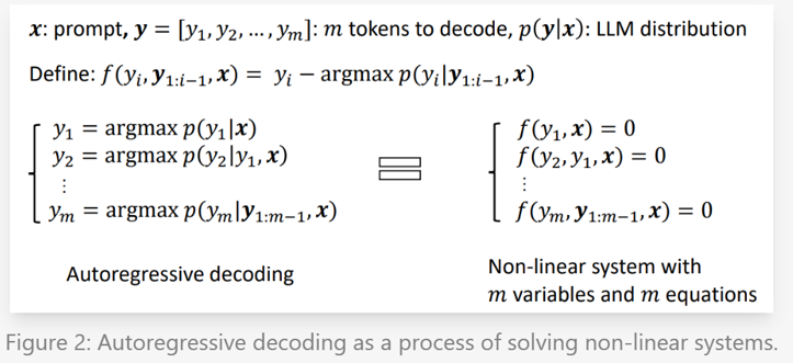 Lookahead Decoding是从Jacobi Decoding发展而来的一个并行解码技术。 Jacobi Decoding的核心思想是先用某种方式得到x的后续若干个token y的可能结果。 然后让模型把[x y]作为输出进行处理,然后用每个位置上的得到的logits更新y中的token,一直迭代直到所有token都被正确更新位置。 如果模型在一次处理的时候有多个token不需要被更新的话,那么就相当于一次推理生成了多个token。 因为prompt多几个token的推理开销是比较小的,在自回归过程中可以忽略不记,因此减少decode次数可以显著地加速模型的推理过程。