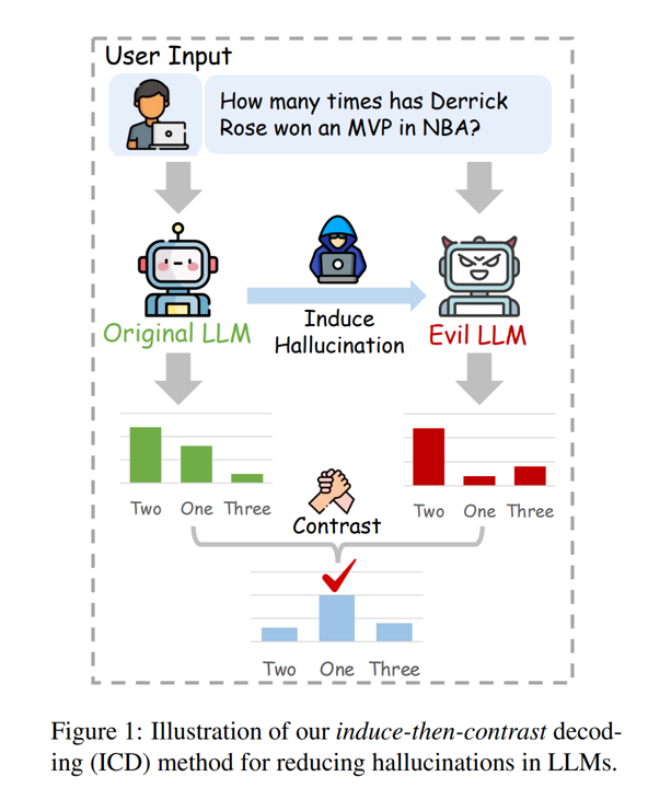 [4]这个工作提出用一种对比解码的方式提高模型生成可信结果的能力。 核心思想是, 构造一个很容易犯错的模型。 那么对于一个困难的任务,虽然原始模型很容易犯错,但是evil LLM更容易犯错,通过对比解码,只需要原始模型更不容易犯错,那么做差之后,那些错误结果的概率就会降低,此消彼长正确答案的概率就变高了,从而提高了模型回答正确的概率。