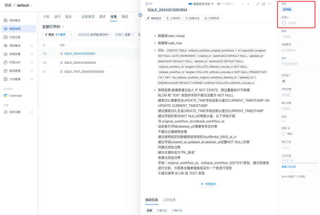 运维人员在 SQL 管控中确认需优化的问题 SQL 后,一键推送至 Coding 平台。系统会在 Coding 自动生成标准格式的任务,包含完整的问题描述和优化建议。