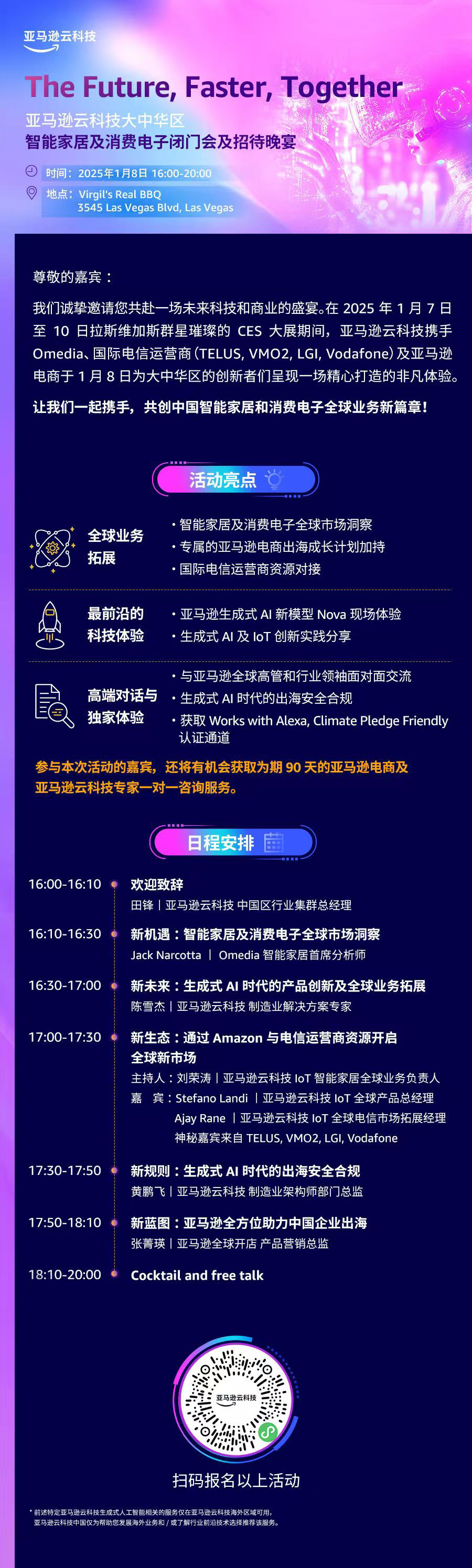 在CES期间,亚马逊展示在汽车、制造、物联网、生成式AI、智能设备、广告、营销的创新。在1月7日至10日前往汽车、IOT体验中心、智能设备展区,扫码留资,您将有机会获得亚马逊智能家居及消费电子出海启航大礼包。