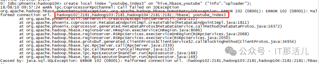 2)hbase-site.xml的zookeeeper的配置信息不能加2181,否则在创建local index的时候会报以下异常