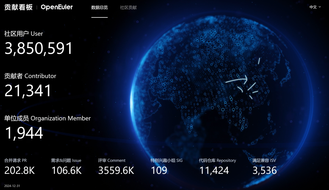 截至2024年12月31日,openEuler 社区用户累计超过385万。超过2.1万名开发者在社区持续贡献。社区累计产生 202.8K个PRs、106.6K条Issues。目前,加入openEuler 社区的单位成员1944家,本月新增68家。