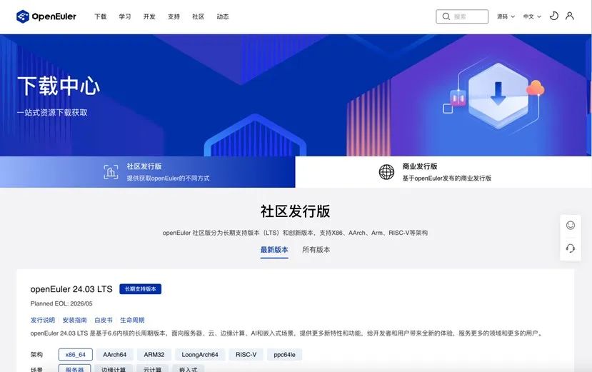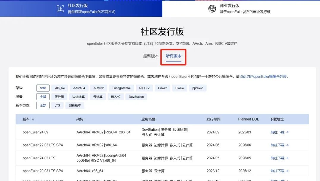 下载中心特别设有“所有版本”,开发者能够迅速访问历史版本的下载页面,并轻松切换至所需版本。经过精心整合,历史下载页面的信息呈现更加集中,简化了查找和下载流程,让开发者能够高效地获取不同版本的openEuler资源。