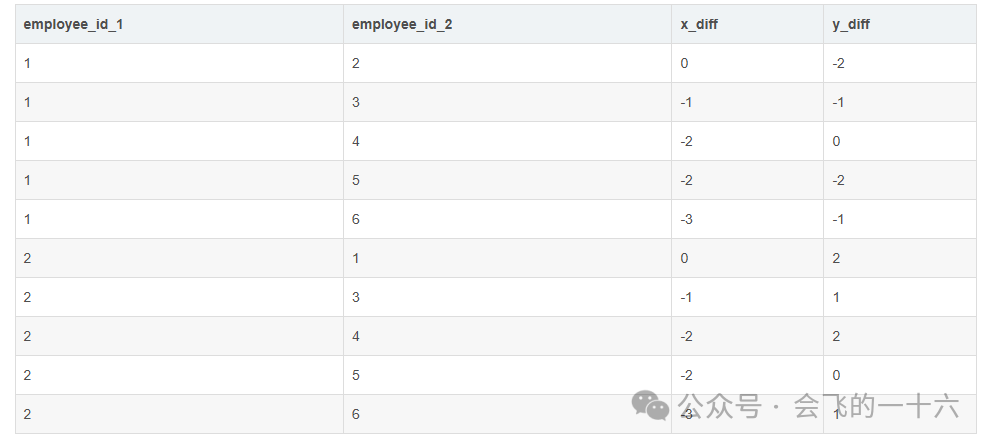 -- 使用分析函数计算坐标差值SELECTe1.employee_id AS employee_id_1,e2.employee_id AS employee_id_2,e1.x_coordinate - e2.x_coordinate AS x_diff,e1.y_coordinate - e2.y_coordinate AS y_diffFROM employees e1JOIN employees e2 ON e1.employee_id!= e2.employee_idORDER BY e1.employee_id, e2.employee_id;