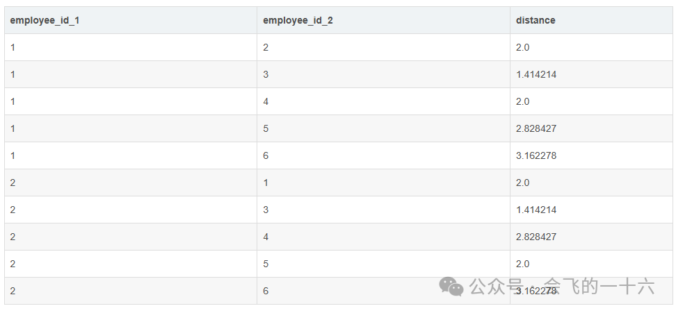 -- 基于坐标差值计算距离SELECTemployee_id_1,employee_id_2,SQRT(POWER(x_diff, 2) + POWER(y_diff, 2)) AS distanceFROM (SELECTe1.employee_id AS employee_id_1,e2.employee_id AS employee_id_2,e1.x_coordinate - e2.x_coordinate AS x_diff,e1.y_coordinate - e2.y_coordinate AS y_diffFROM employees e1JOIN employees e2 ON e1.employee_id!= e2.employee_id) subquery;