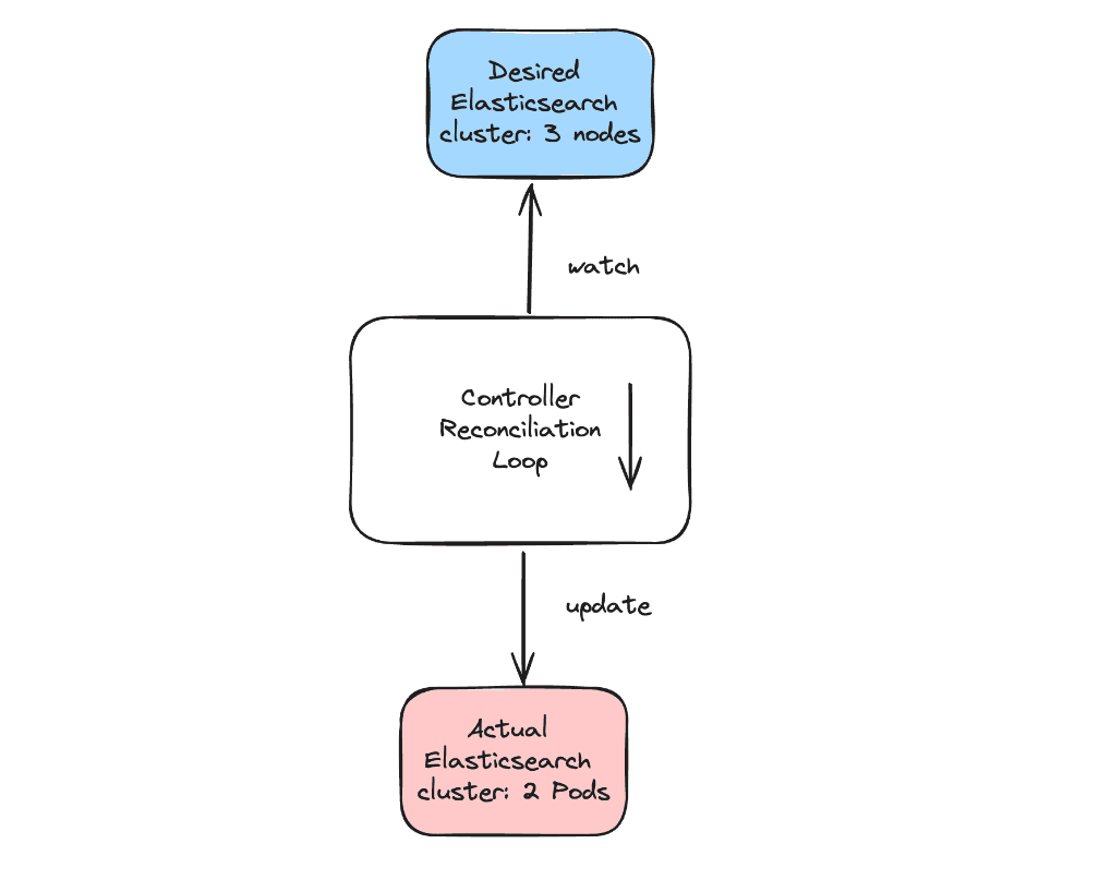 Kubernetes 控制器[5] 以一种简单、可重复和可预测的方式运行。它们被编程为 监视 事件源。在任何事件(创建、更新、删除)发生时,它们总是触发相同的 协调 函数。该函数负责比较资源的 期望状态(例如,一个 3 节点的 Elasticsearch 集群)与该资源的 实际状态(例如当前的 Elasticsearch 集群有 2 个节点),并采取行动使实际状态向期望状态靠拢(增加 Elasticsearch 部署的副本数)。