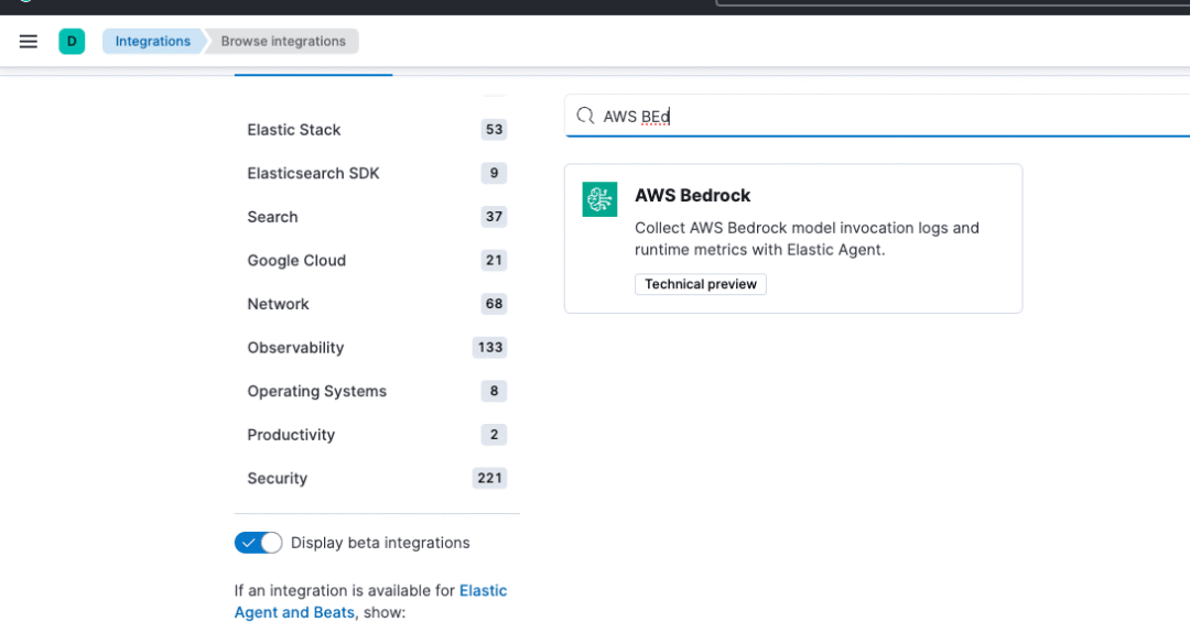 要在新创建的策略中配置 Amazon Bedrock 集成,请使用引导步骤添加 Amazon Bedrock 集成:将 Elastic Agent 集成添加到策略[22]。启用 Beta 集成以使用 Amazon Bedrock 集成,如下图所示。