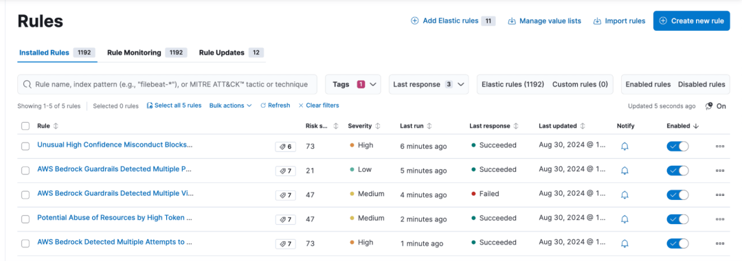 要启用预构建检测规则,首先登录到 Elastic 实例,从左侧导航栏导航到 Security → Rules → Detection rules (SIEM)。从标签部分过滤“数据源:Amazon Bedrock”。
