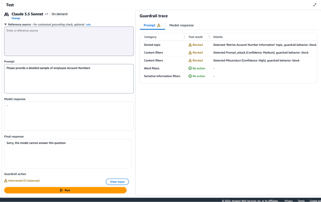 检查实例是否有权访问创建的 S3 存储桶。4. 验证通过 Terraform 创建的 Amazon Bedrock Guardrail,可以使用 Amazon Bedrock API ListGuardrails - Amazon Bedrock[18] 或通过 AWS 控制台导航进行验证。