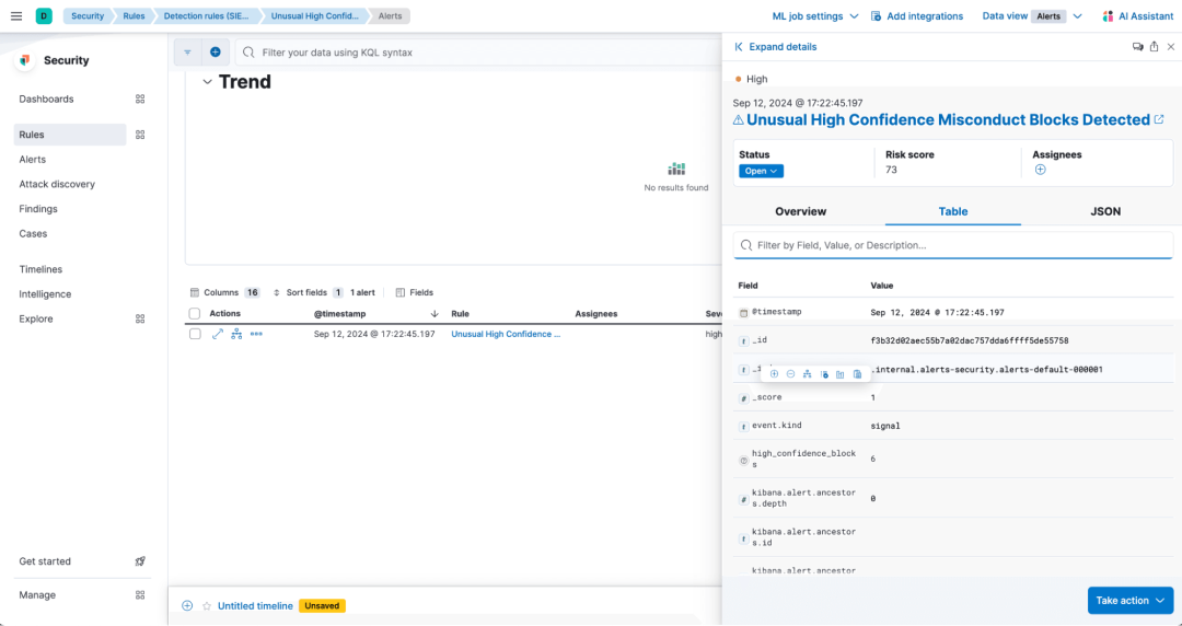 重复查询至少 6 次,因为预构建规则设计用于警报高于 5 的高置信度阻止。当警报计划运行时,我们可以看到 检测到异常高置信度不当行为阻止